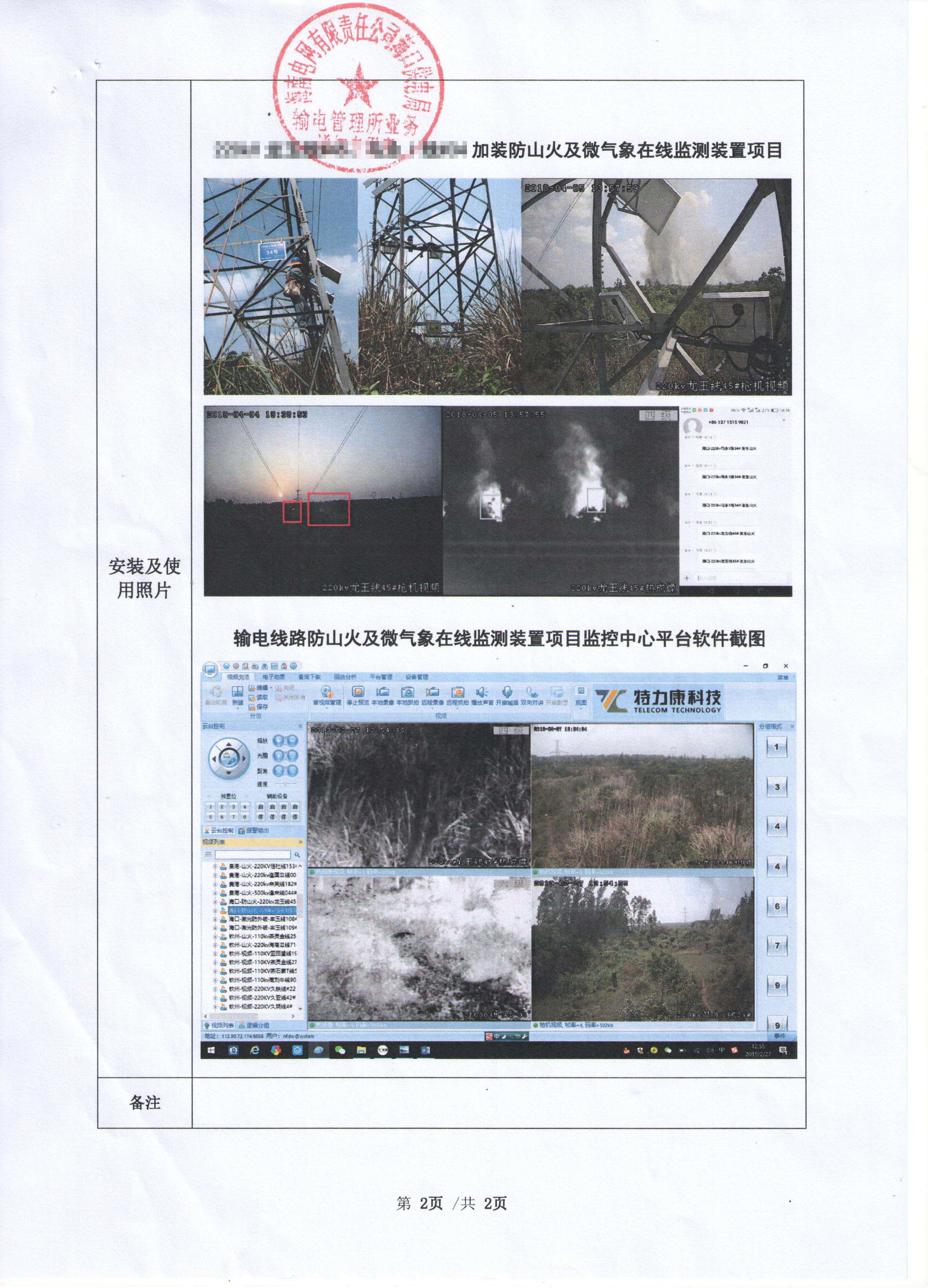 2018年1月26日??诠╇妴挝辉谳爡^(qū)管理線路安裝我司(深圳市特力康科技有限公司)輸電線路防外破裝置,該裝置應局方要求加裝了微氣象監(jiān)測裝置及防山火裝置,監(jiān)測塔桿線路走廊以及周邊森林區(qū)域山火情況。