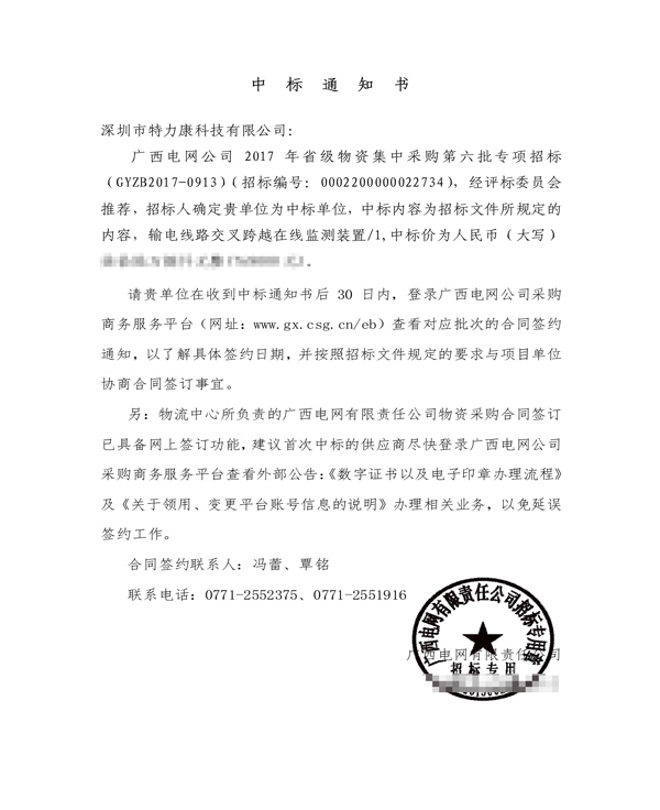 特力康中標國網(wǎng)黑龍江送變電工程公司的2024年度第18次物資類競爭性談判采購項目——慶陽驅鳥器物資框 特力康中標國網(wǎng)甘肅省電力公司省管產業(yè)單位2024年第五次物資競爭性談判授權采購項目 中標喜訊:深圳市特力康科技有限公司成功入圍許繼集團綜合能源公司輸電線路視頻在線監(jiān)測裝置模塊集采項目 中標喜訊:特力康成功中標國網(wǎng)重慶市電力公司渝中一片區(qū)項目 特力康成功中標國網(wǎng)天津市電力公司2024年第二次?物?資招標項目 特力康中標國網(wǎng)安徽省電力有限公司蕪湖供電公司2024年3月非物質采購項目 風雪中的 “防冰哨兵”:內蒙古電力用特力康監(jiān)測系統(tǒng)筑牢覆冰防線 雙軸感知護塔穩(wěn):山西電力用特力康裝置破解采空區(qū)傾斜難題 江西電力裝上 “智能防鳥衛(wèi)士”—— 特力康綜合激光驅鳥器破解湖區(qū)變電站鳥害難題 破解巡檢難題:貴州電力用特力康 AI 微拍裝置,精準捕捉線路隱性隱患 精準捕捉 “微氣象”:浙江電力用特力康預警系統(tǒng)筑牢電網(wǎng)氣候防線 守護 “電力咽喉”:湖南電力投用百套特力康三跨 4G 監(jiān)控球,筑牢安全防線 貴州電力裝特力康電網(wǎng)架空線路覆冰監(jiān)測系統(tǒng),精準防冰保電網(wǎng)過冬? 寧夏配電線路安裝了我司防外破電子化智能警示牌