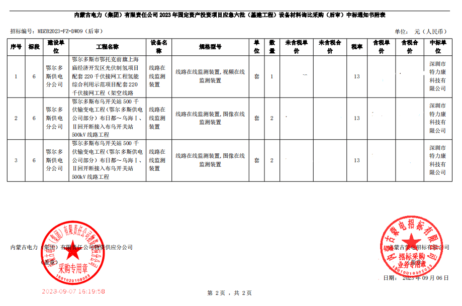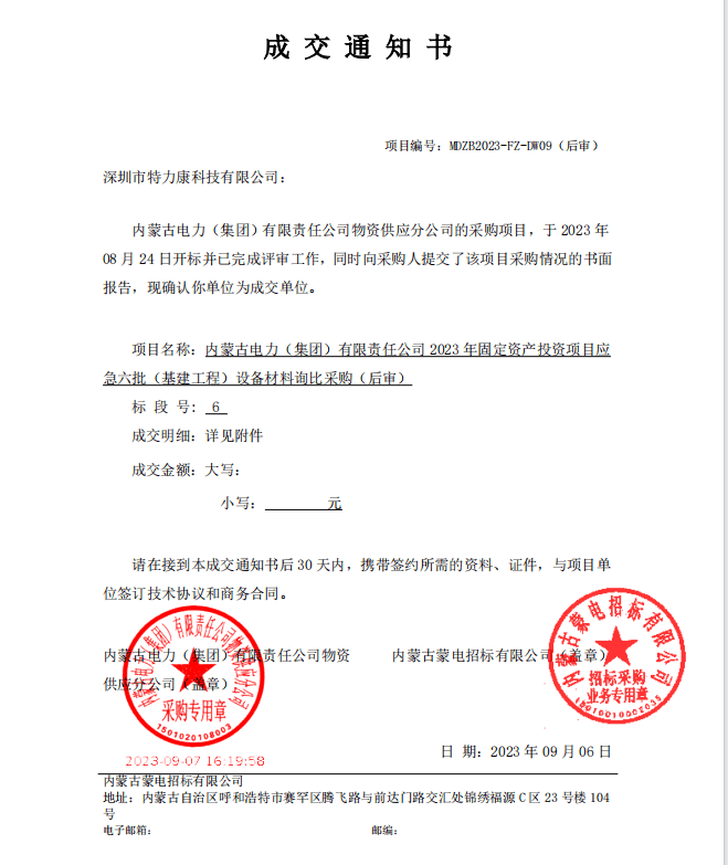 內(nèi)蒙古電力(集團(tuán))有限責(zé)任公司物資供應(yīng)分公司的采購(gòu)項(xiàng)目,于2023年08月24日開(kāi)標(biāo)并已完成評(píng)審工作,同時(shí)向采購(gòu)人提交了該項(xiàng)目采購(gòu)情況的書(shū)面報(bào)告,現(xiàn)確認(rèn)我單位為成交單位,中標(biāo)通知如下: