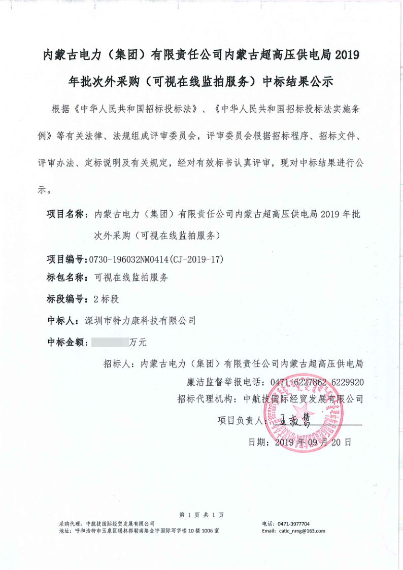 經(jīng)審委員會(huì)根據(jù)招標(biāo)程標(biāo)次評(píng)審、定標(biāo)說(shuō)明及有關(guān)規(guī)定,經(jīng)對(duì)有效標(biāo)書(shū)認(rèn)真評(píng)審,確定我司為內(nèi)蒙古電力(集團(tuán))有限責(zé)任公司內(nèi)蒙古超高壓供電局2019年批次外采購(gòu)(可視在線監(jiān)測(cè)服務(wù))項(xiàng)目中標(biāo)單位。