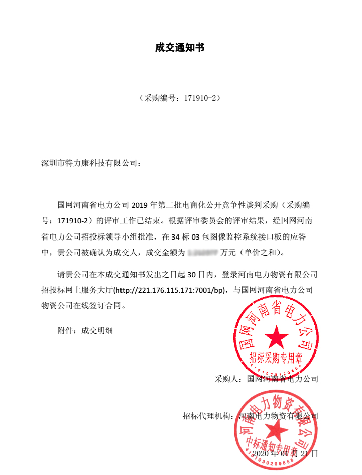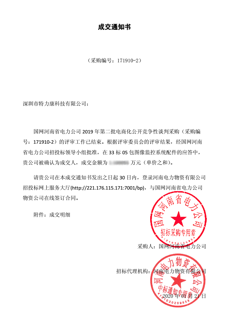 國(guó)網(wǎng)河南省電力公司2019年第二批電商化公開(kāi)競(jìng)爭(zhēng)性談判采購(gòu)(采購(gòu)編號(hào): 171910-2) 談判工作已結(jié)束,經(jīng)評(píng)審委員會(huì)評(píng)審,并報(bào)公司招投標(biāo)工作領(lǐng)導(dǎo)小組批準(zhǔn),我司中標(biāo)國(guó)網(wǎng)河南省電力公司2019年第二批電商化公開(kāi)競(jìng)爭(zhēng)性談判采購(gòu)33標(biāo)05包圖像監(jiān)控系統(tǒng)配件及34標(biāo)03包圖像監(jiān)控系統(tǒng)接口板,中標(biāo)通知如下: