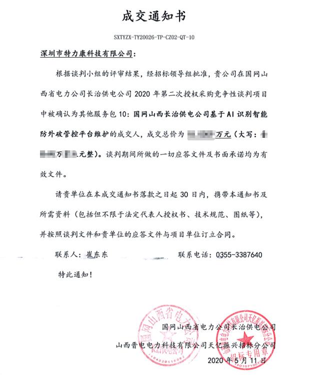根據(jù)談判小組的評(píng)審結(jié)果,經(jīng)招標(biāo)領(lǐng)導(dǎo)組批準(zhǔn),我司(深圳市特力康科技有限公司)在國(guó)網(wǎng)山西省電力公司長(zhǎng)治供電公司2020年第二次授權(quán)采購(gòu)競(jìng)爭(zhēng)性談判項(xiàng)目中被確認(rèn)為其他服務(wù)包10:國(guó)網(wǎng)山西長(zhǎng)治供電公司基于AI識(shí)別智能防外破管控平臺(tái)維護(hù)的成交人?,F(xiàn)附中標(biāo)通知書如下: