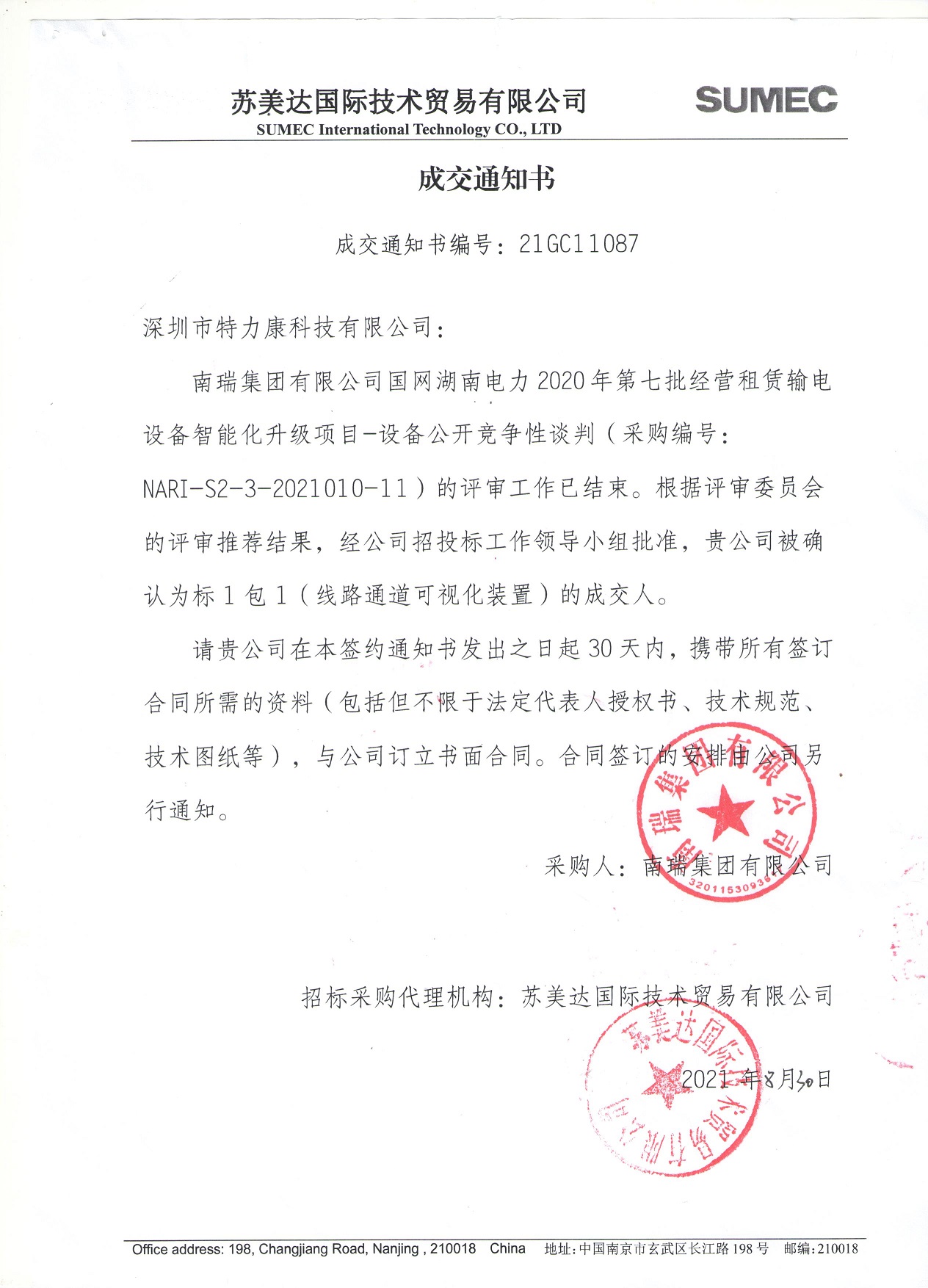 南瑞集團(tuán)有限公司國網(wǎng)湖南電力2020年第七批經(jīng)營租賃輸電設(shè)備智能化升級項(xiàng)目-設(shè)備公開競爭性談判(采購編號:NARI-S2-3-2021010-11 )的評審工作已結(jié)束。根據(jù)評審委員會的評審?fù)扑]結(jié)果,經(jīng)公司招投標(biāo)工作領(lǐng)導(dǎo)小組批準(zhǔn),我司被確認(rèn)為標(biāo)1包1 (線路通道可視化裝置)的成交人。中標(biāo)公告如下:
