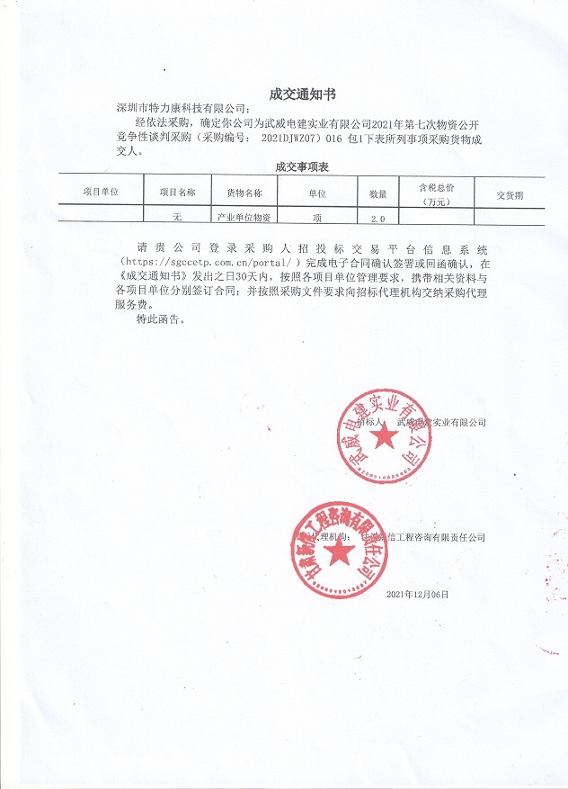 經(jīng)依法采購(gòu),確定我司為武威電建實(shí)業(yè)有限公司2021年第七次物資公開競(jìng)爭(zhēng)性談判采購(gòu)(采購(gòu)編號(hào): 2021DJWZ07) 016包I下表所列事項(xiàng)采購(gòu)貨物成交人。成交通知如下:
