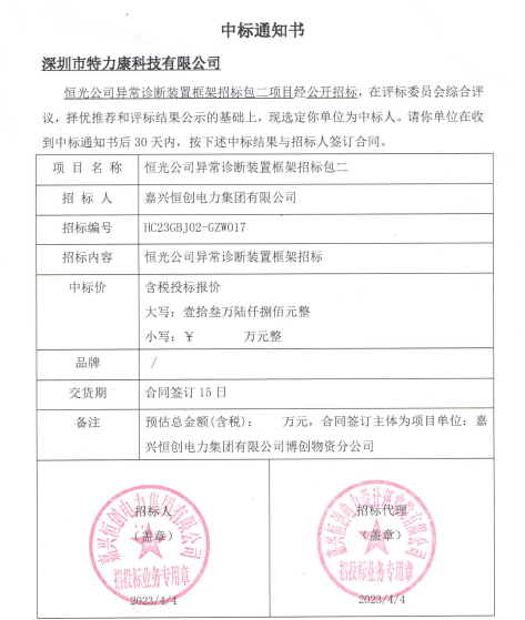 恒光公司異常診斷裝置框架招標包二項目經公開招標,在評標委員會綜合評議,擇優(yōu)推薦和評標結果公示的基礎上,現選定我司為中標人,中標通知如下: